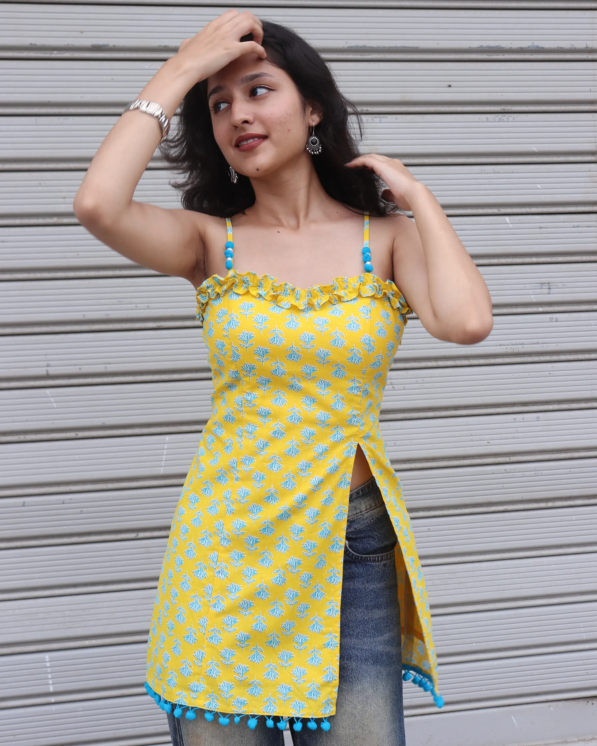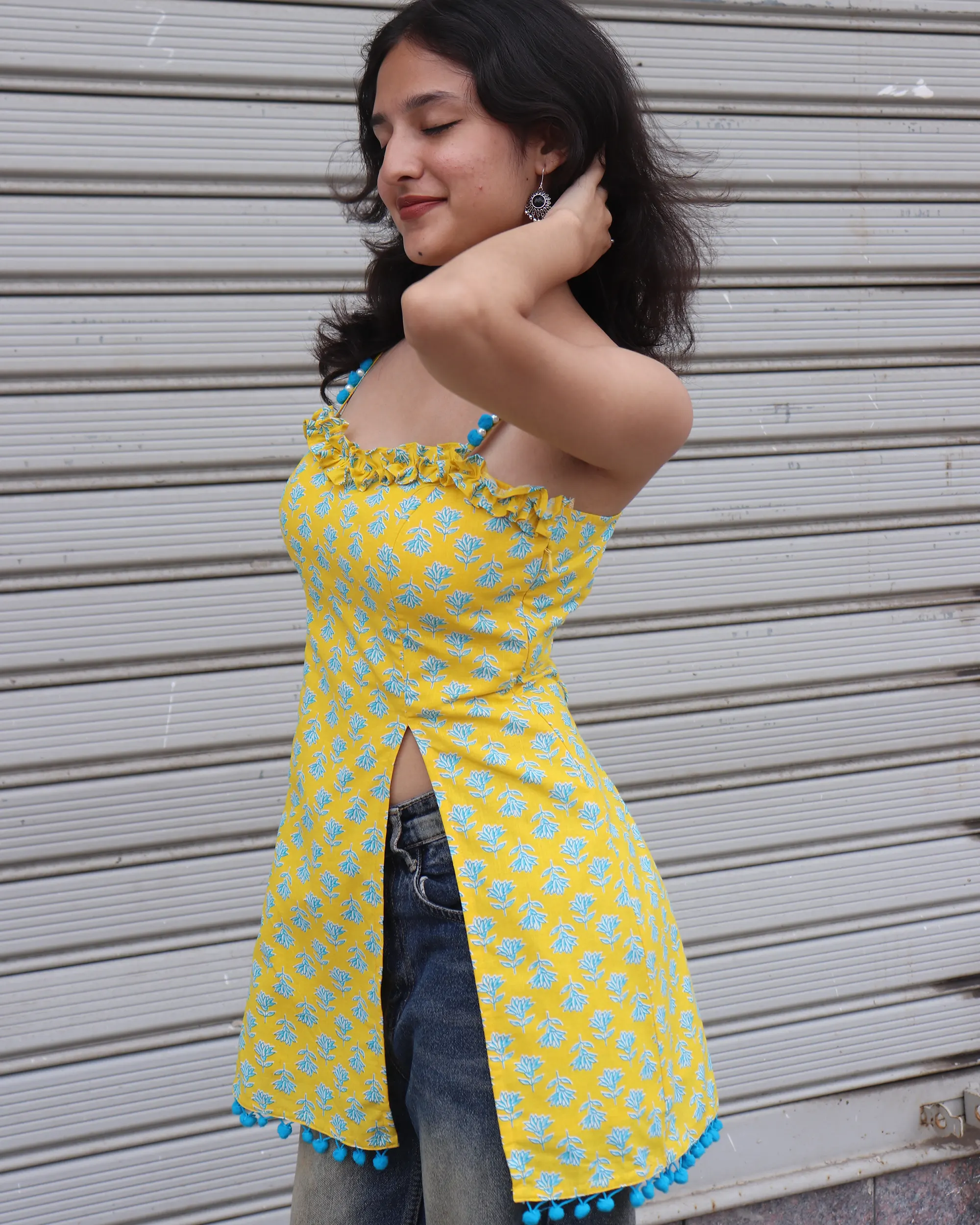 Crafted in 100% pure cotton, this vibrant yellow kurti is designed to keep you effortlessly chic and comfortable. It features:
